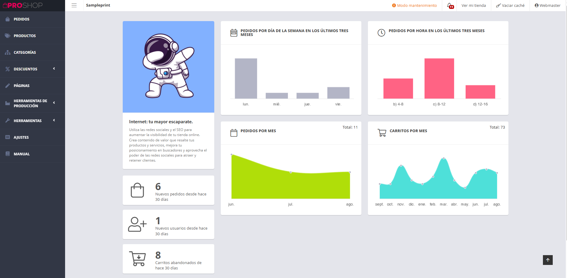 En la página de inicio del gestor de la tienda presenta un panel central con estadísticas relacionadas con las ventas