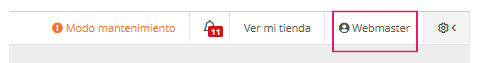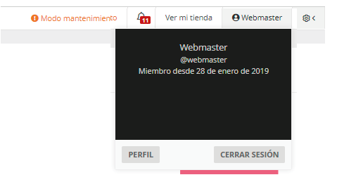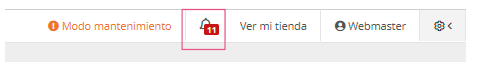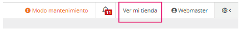 - Alerta de estado del e-commerce relativo al modo mantenimiento que actúa como botón para acceder a ajustes para cambiar estado de la tienda y ver la tienda en modo mantenimiento.