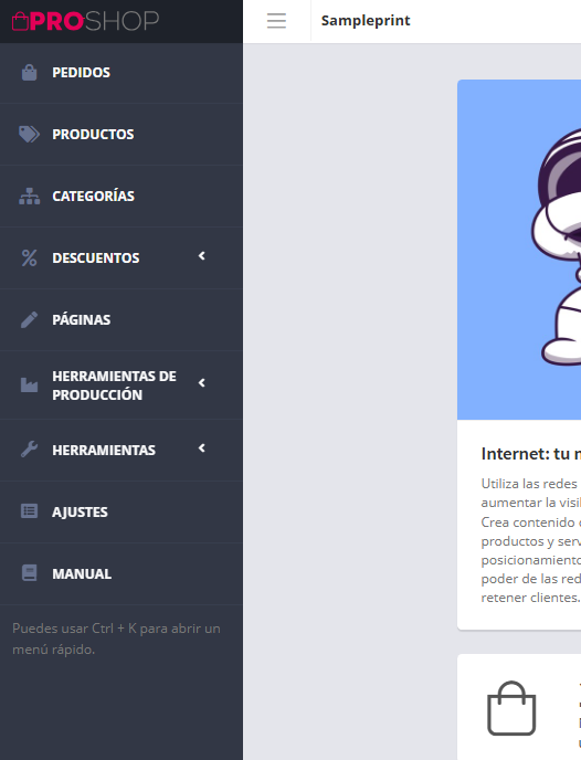 El gestor de Wakaprint presenta un menú de navegación lateral. Accesible desde cualquier página del gestor.