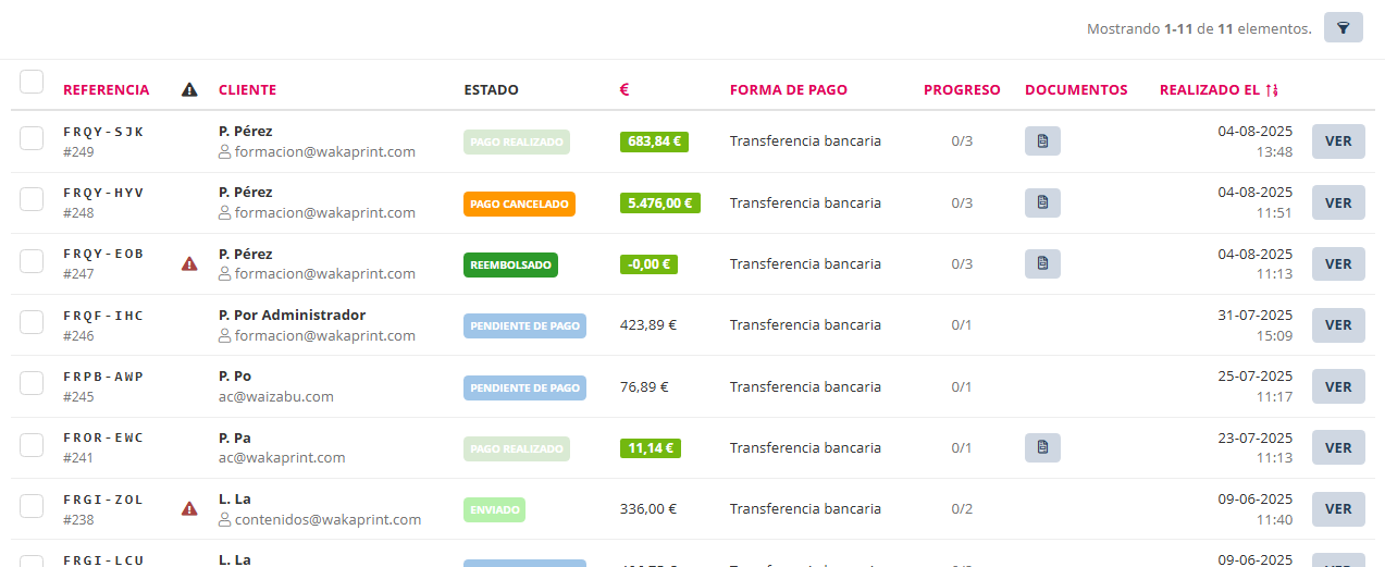 • Cuando un cliente tramita un pedido se queda registrado en esta sección.
