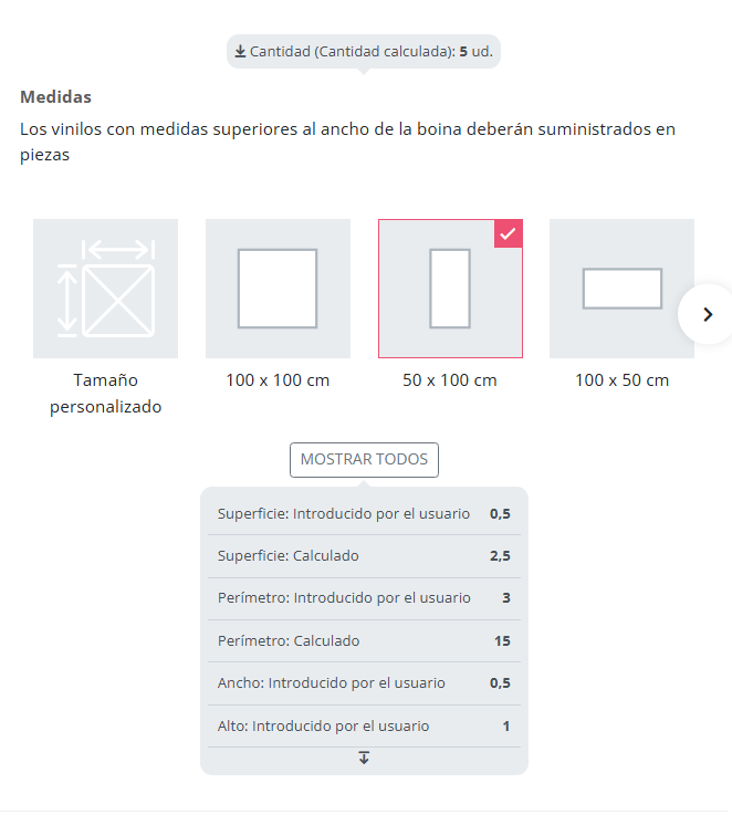 - La característica de tipo Medidas es especial, ya que permite al cliente definir un ancho y un alto para el producto.