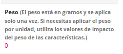 El peso en este ajuste no multiplica por las unidades de producto. Este peso se aplica solo una vez. Si se necesita aplicar peso por unidades utilizar el campo de peso variable presente en los valores en las características.