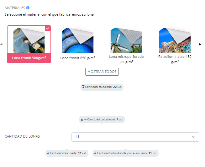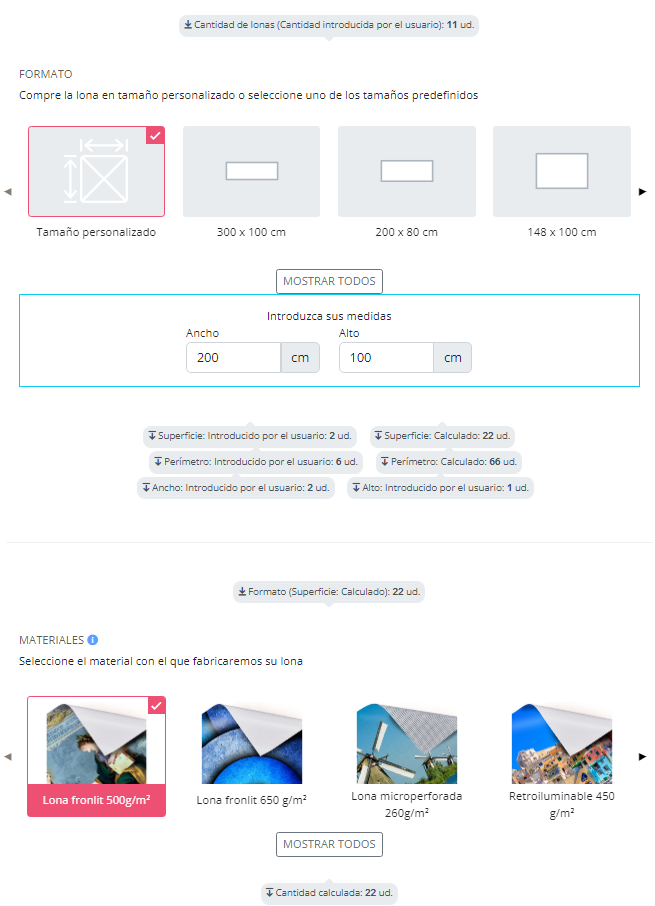 "Formato" reciba unidades de "Cantidad de lonas | Introducida por el usuario"