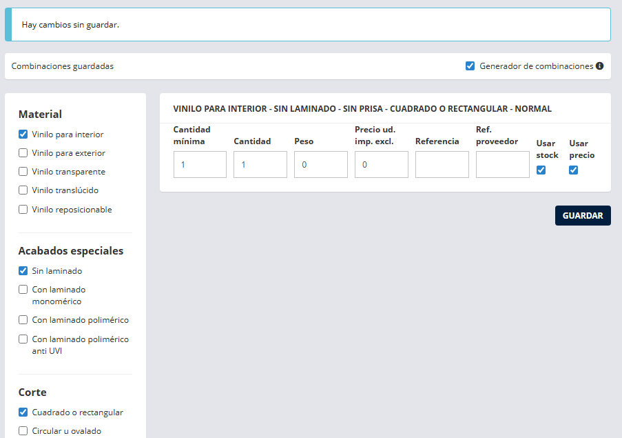 | Generador de combinaciones | Casilla activada. Al estar marcada, permite seleccionar distintas opciones de características para crear combinaciones automáticamente. |