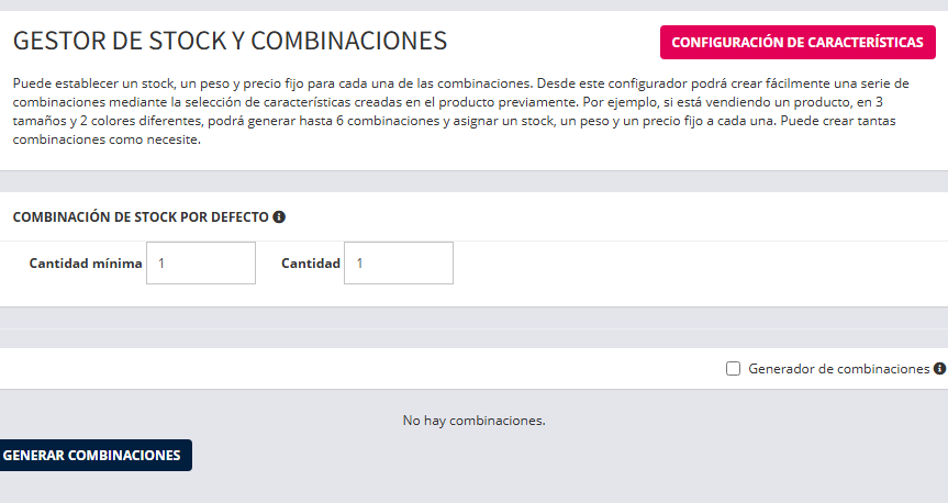 | Generador de combinaciones | Casilla de verificación. Al activarla, permite generar automáticamente combinaciones basadas en las características creadas previamente en el producto. |