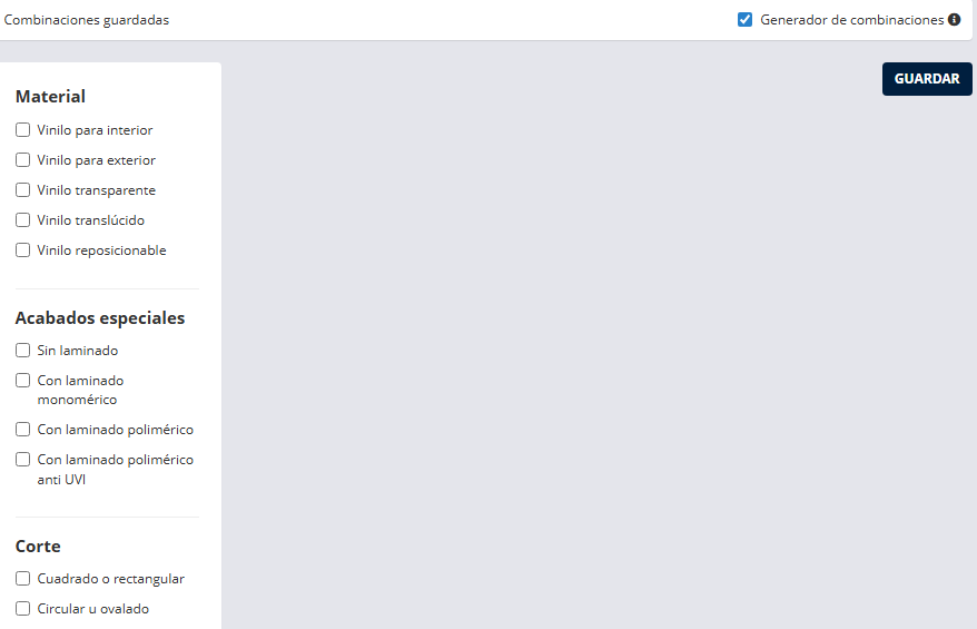 | Grupo de opciones con casillas | Permite seleccionar uno o varias opciones disponibles para el producto (por ejemplo: vinilo interior, exterior, transparente, etc.). Cada selección formará parte de una combinación distinta. |