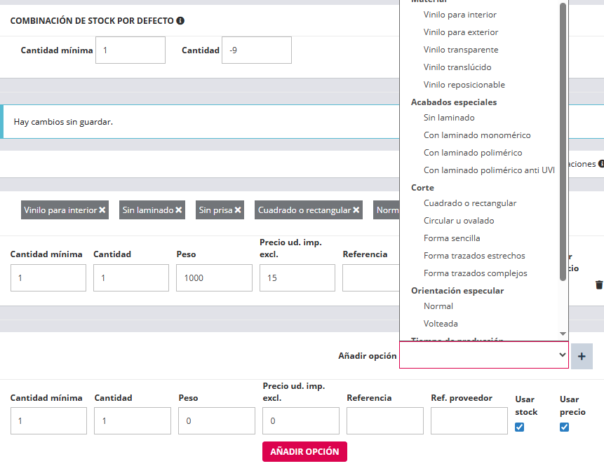 Se pueden generar tantas combinaciones como permitan las características y valores del producto con el botón tipo selector desplegable llamado "Añadir Opción".