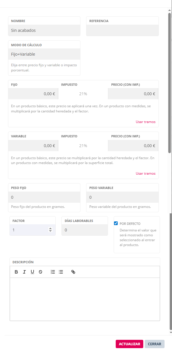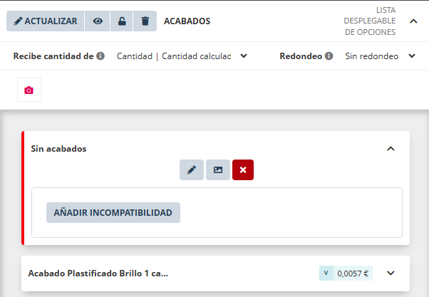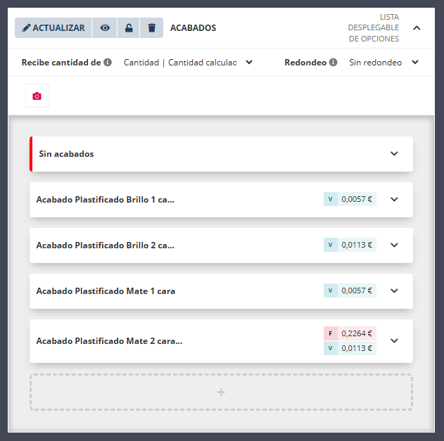 Cuando un valor tiene ajustado un importe fijo y/o importe variable se muestra en la lista de los valores de la característica.
