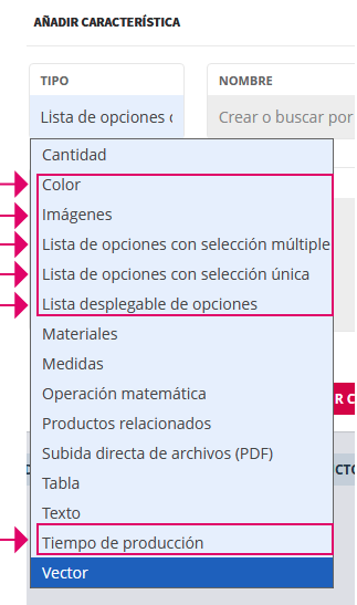 - Como se explica en el capítulo Productos. Las opciones que se le ofrecen al cliente para configurar el producto se crean mediante lo que se ha llamado "Características".