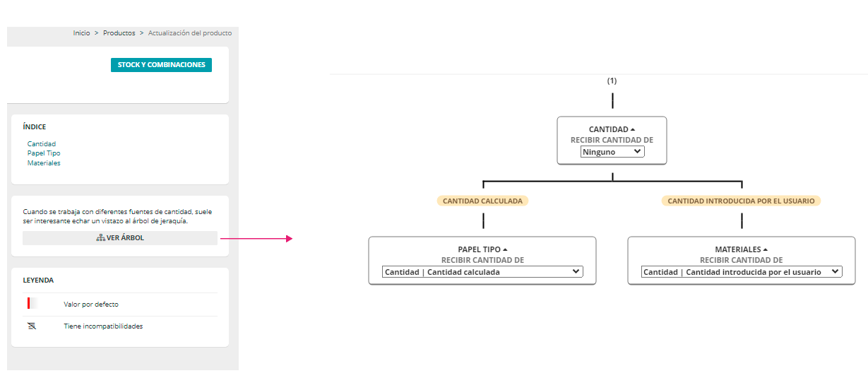 - El árbol de cantidades. Para mejor comprensión de la lógica del Flujo de cantidad de unidades en cada producto con el modo de características en avanzado se dispone de la herramienta "Árbol".