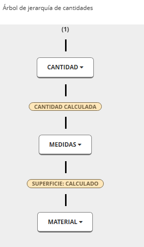 La tercera y última característica de la rama es la característica llamada "Material". Es la que tiene establecidos en sus valores importes de variable superiores a 0. Recibe cantidad de: Medidas | Superficie Calculado. Es decir, recibe las unidades resultantes de multiplicar las unidades de producto por la superficie de cada unidad de producto.