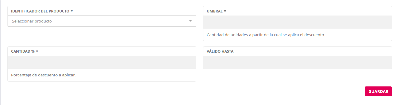 | Umbral | Cantidad de unidades a partir de la cual se aplica el descuento. Requerido. |