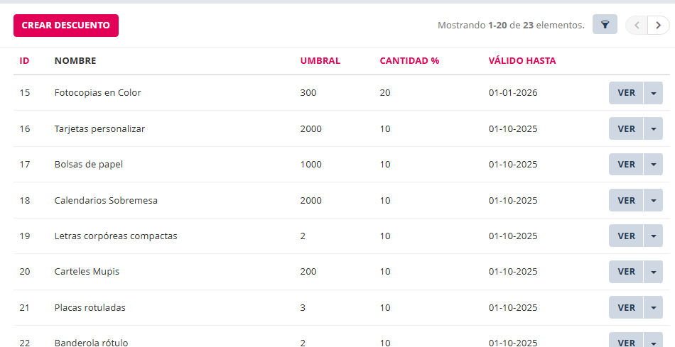 Aquí se crean descuentos para los productos. Uno por producto. Vista de descuentos de producto en modo lista.