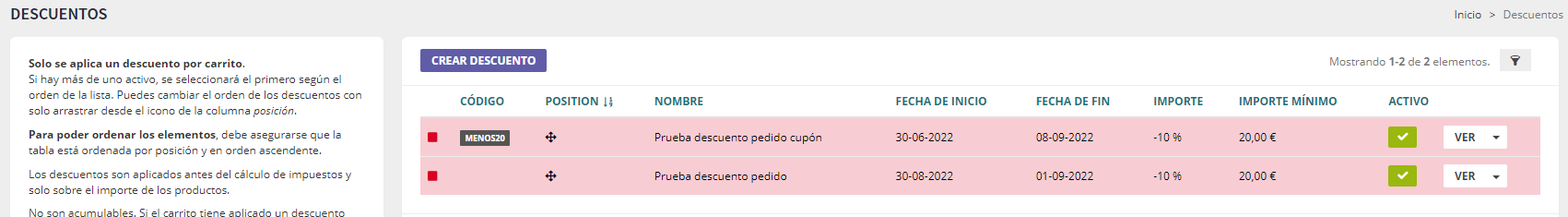 Si hay más de uno activo, se seleccionará el primero según el orden de la lista. Se puede cambiar el orden de los descuentos con solo arrastrar desde el icono de la columna posición. Para poder ordenar los elementos, debe asegurarse que la tabla está ordenada por posición y en orden ascendente.