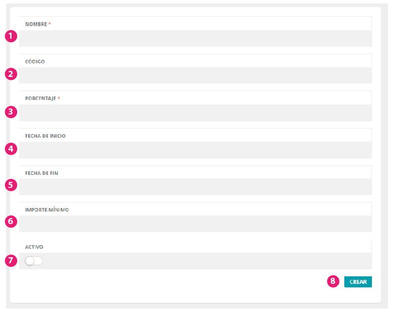 - Especificar el importe en porcentaje de descuento a aplicar.