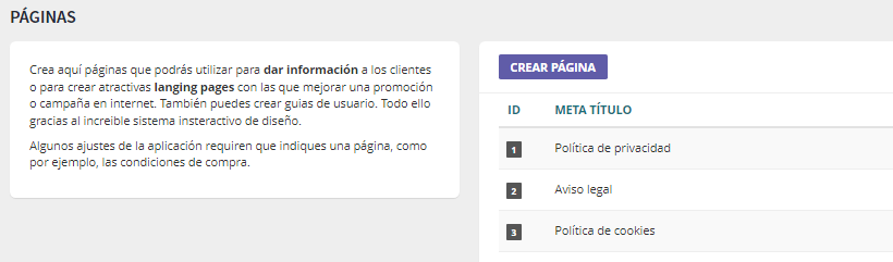 Estas páginas se utilizan para resolver dudas, explicar servicios o procesos y mejorar la confianza del cliente (por ejemplo: Envíos y devoluciones, Preguntas frecuentes, Guías de compra, Sobre nosotros). Además, ayudan a mejorar el posicionamiento orgánico (SEO) al incluir contenido relevante relacionado con el negocio.