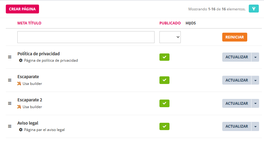 Además cada fila del listado dispone de un botón para activar o desactivar la publicación de la página e información destacada indicando si la página se está utilizando (etiqueta en color turquesa) en algún apartado de ajustes generales, o si está creada usando Builder (icono de herramienta en blanco sobre fondo naranja).