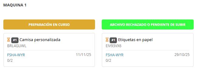Ejemplo: Pendiente de producir, Plóter de impresión, Laminadora, Finalizado.