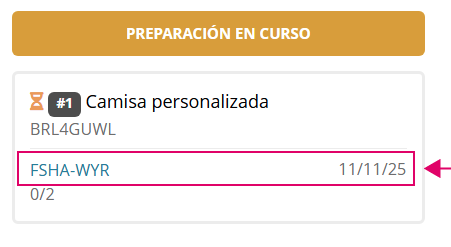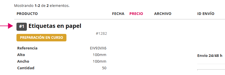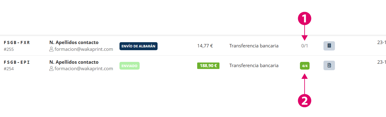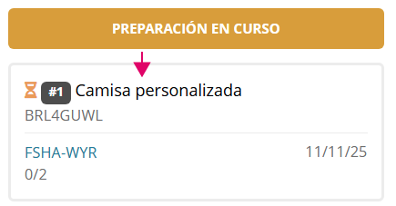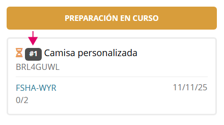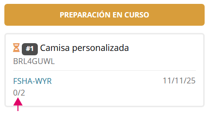 Después de la referencia del pedido y fecha de tiempo de producción se muestra el dato de cantidad de productos enviados / total productos del pedido.