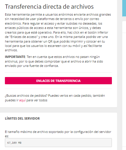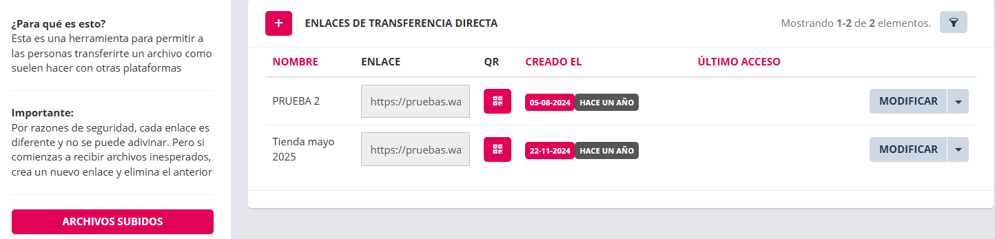 En esta sección se encuentra además el botón para acceder a la interfaz de creación de enlaces para transferencia directa de archivos.