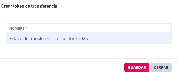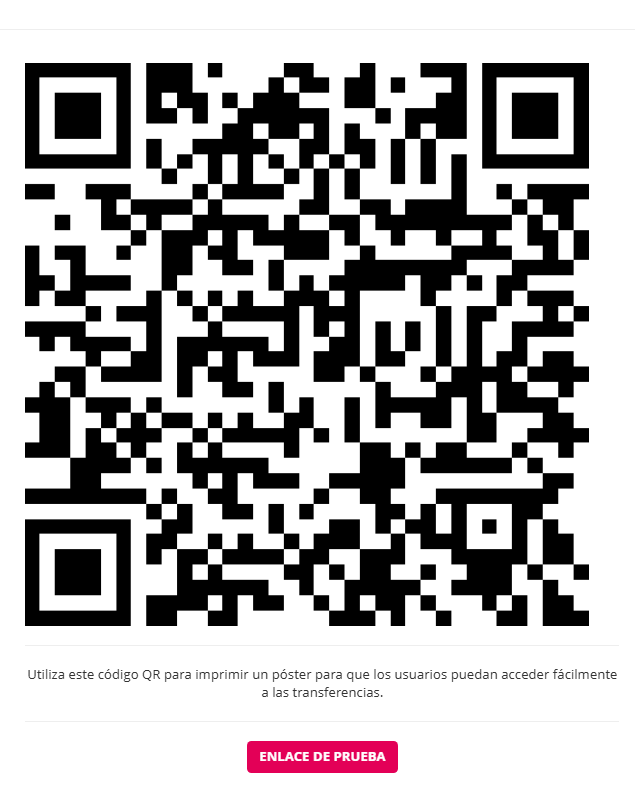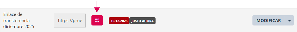 - Al guardar se crea automáticamente el enlace de transferencia y el QR correspondiente. Se muestra el última en la lista de enlaces de transferencia creados.