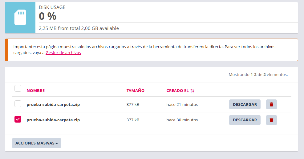 Desde el botón de "ARCHIVOS SUBIDOS" presente en la primera capa de Enlaces de transferencia directa se accede a la página en la que se encuentran los archivos subidos por este método. Segunda capa de "Herramienta de transferencia directa de archivos".