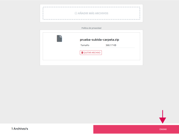 - Seleccionar archivo. Se pueden subir múltiples archivos y también subir archivos tipo carpetas comprimidas. Dispone de un botón para eliminar los archivos subidos en el supuesto de que se necesite.
