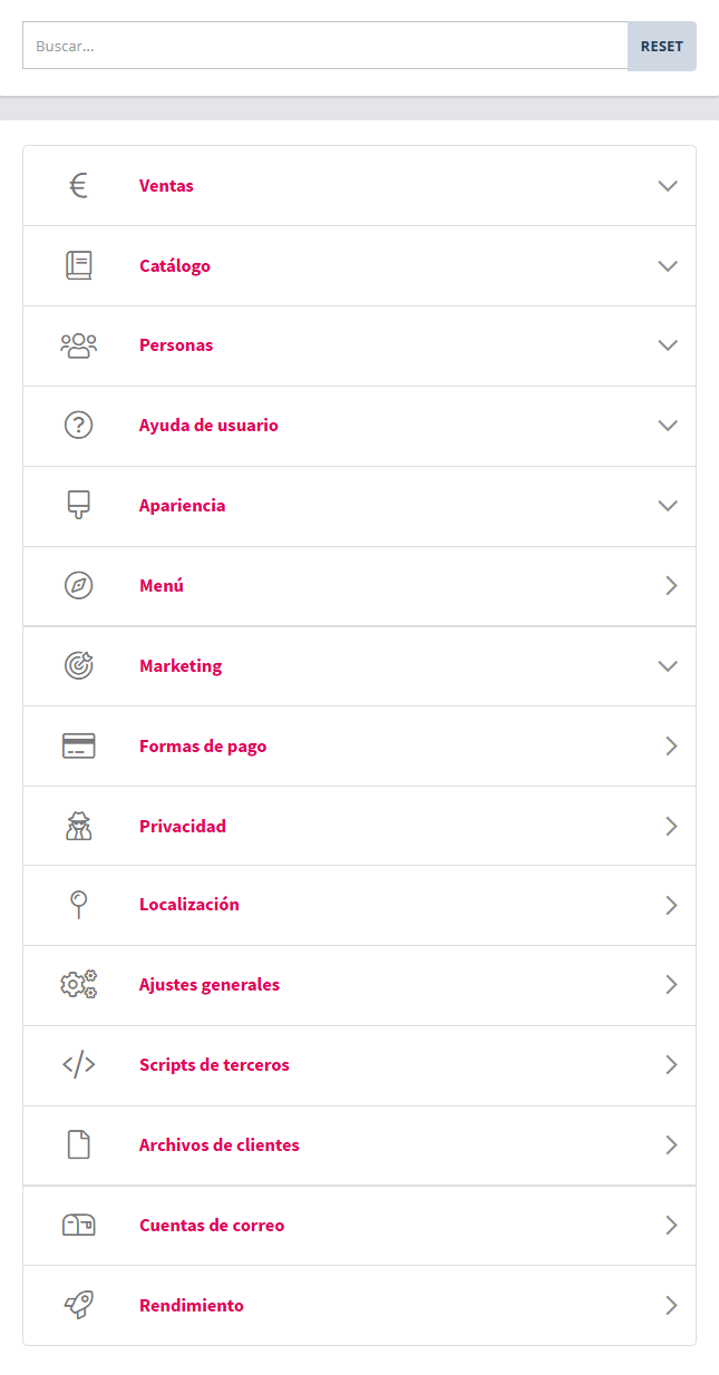 Además de las opciones del submenú, dispone de un buscador de opciones presentes en el submenú Ajustes.