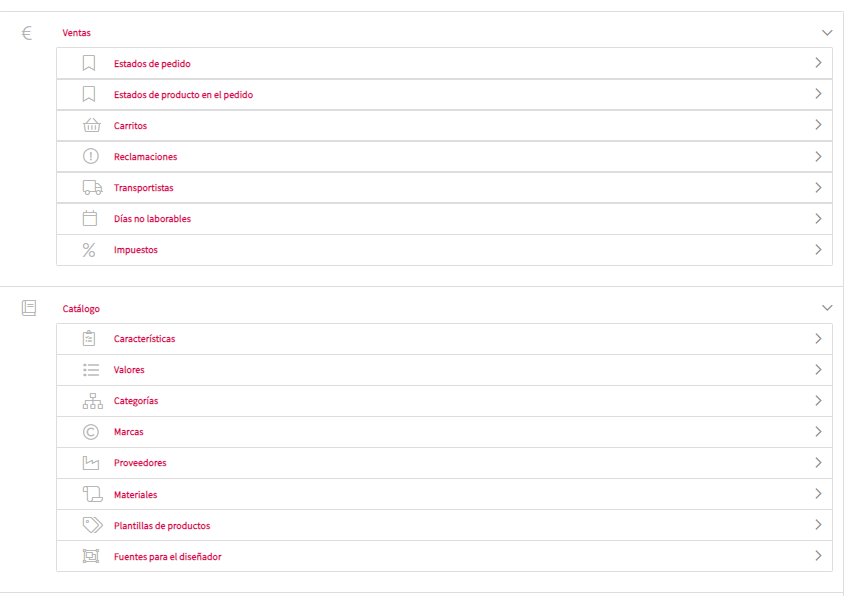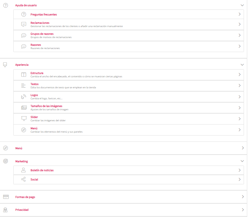 En la sección Ajustes se accede a un menú para acceso a las subsecciones de ajustes.