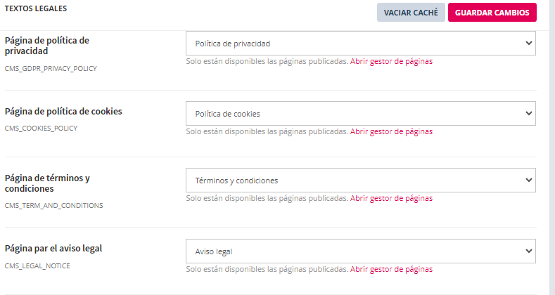 En esta sección el administrador puede hacer todos los ajustes pero ha de tener en cuenta que las páginas ajustadas deben aportar la información relativa a cada tipo de texto legal. Requiere guardado y posiblemente vaciado de caché.