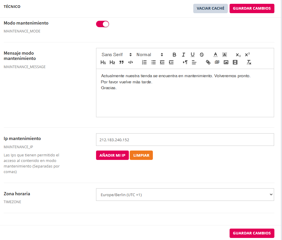 La sección Técnico reúne los ajustes relacionados con el estado operativo de la tienda. Desde este apartado se puede activar o desactivar el modo mantenimiento, definir el mensaje que se muestra a los visitantes durante este estado, gestionar las direcciones IP con acceso permitido y establecer la zona horaria del sistema.
