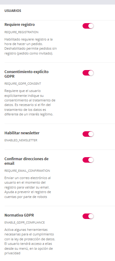 Habilitado requiere registro a la hora de hacer un pedido. Deshabilitado permite pedidos sin registro (pedido como invitado). - Consentimiento explícito GDPR