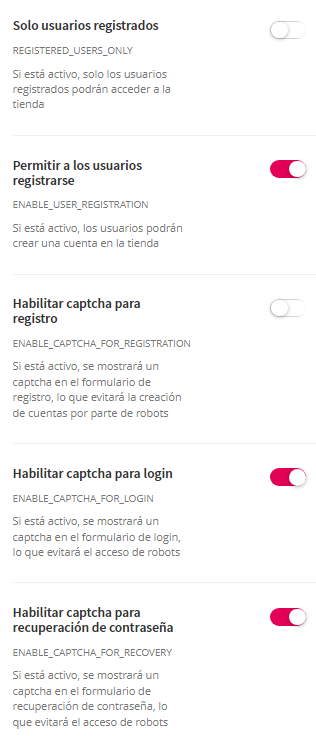 | Solo usuarios registrados | Restringe el acceso a la tienda únicamente a usuarios registrados cuando está activo. |