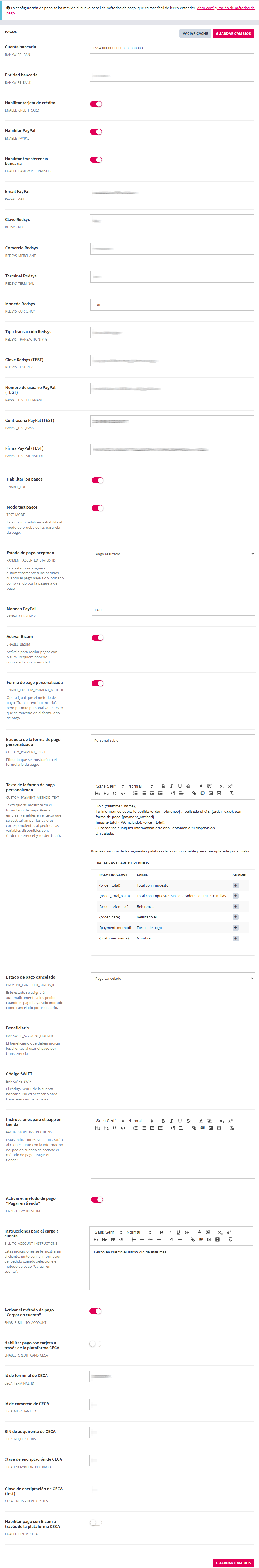 En la página de Ajustes generales denominada Pagos se configuran todos los parámetros relacionados con los métodos de pago disponibles en la tienda online y con la gestión de las transacciones.