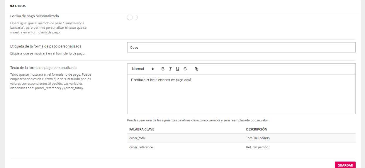 Pago por transferencia: se debe proporcionar la información que sea necesaria para que los clientes comprendan cómo realizar el pago, entre los que se incluyen el número de cuenta y el destinatario. La plataforma ya le indica al cliente que debe realizar una transferencia bancaria a los datos indicados.
