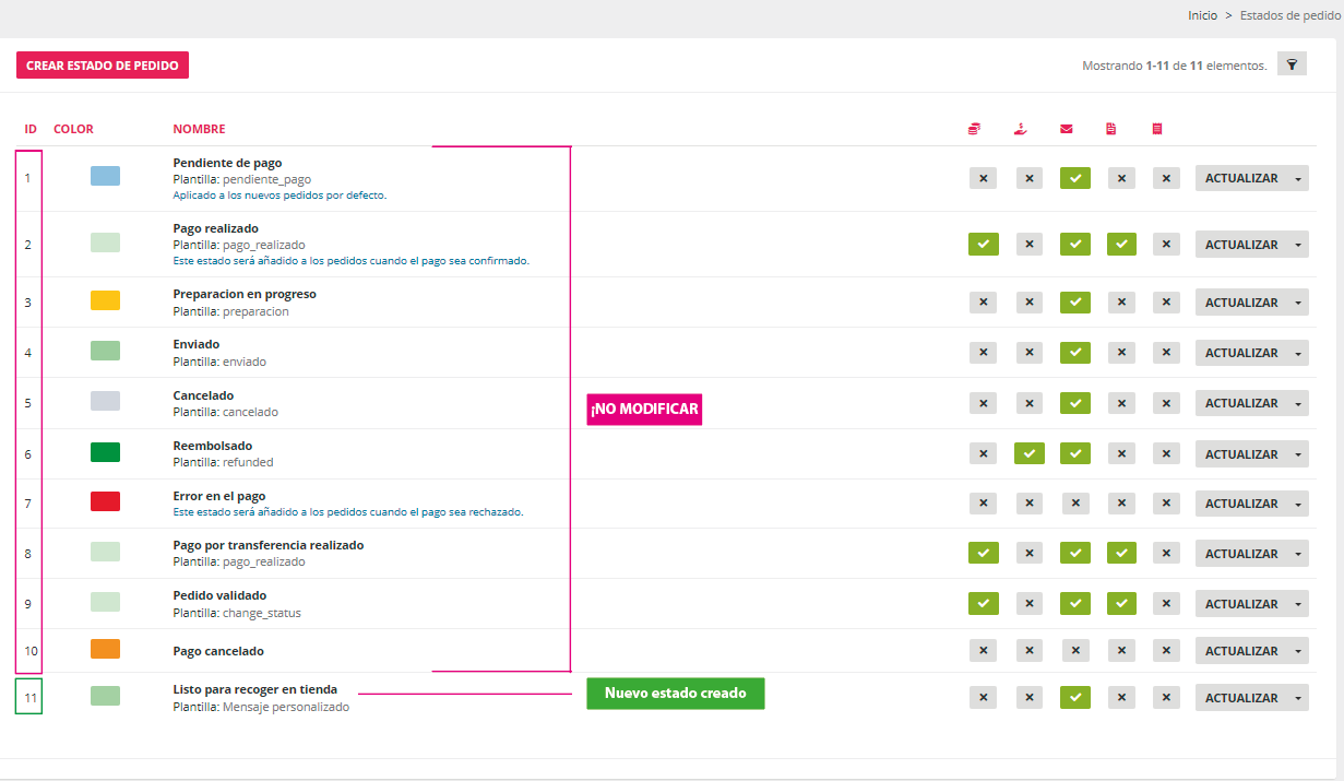 Se pueden crear nuevos estados del pedido y editar un mensaje para que se le envíe al cliente mediante un correo de forma automática al cambiar el pedido a ese estado.