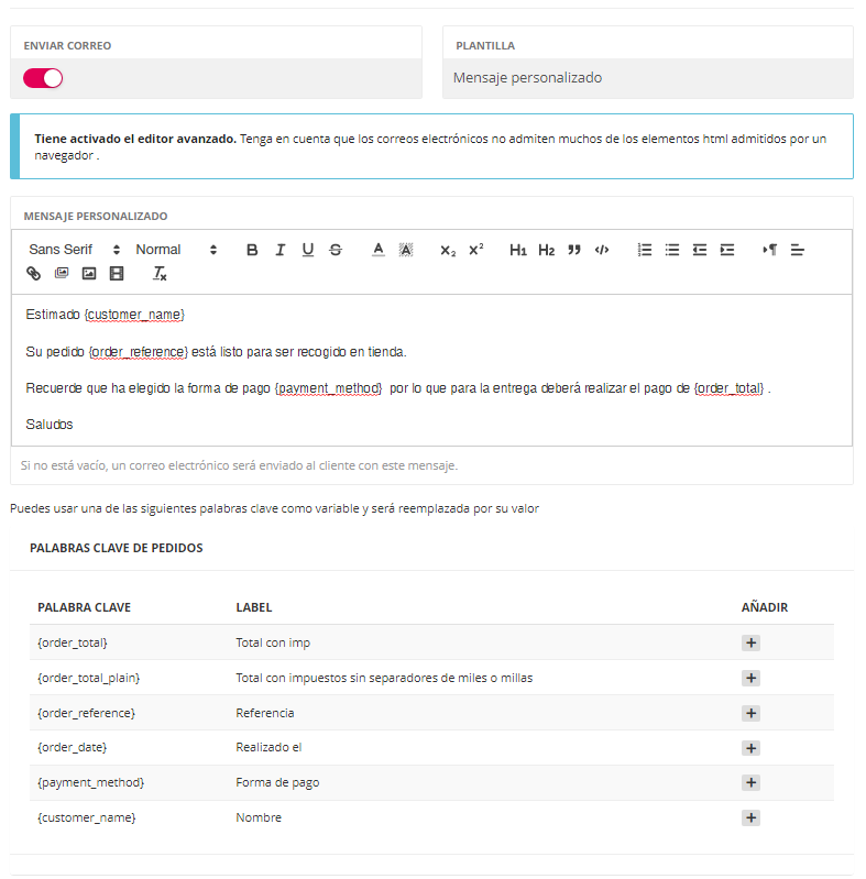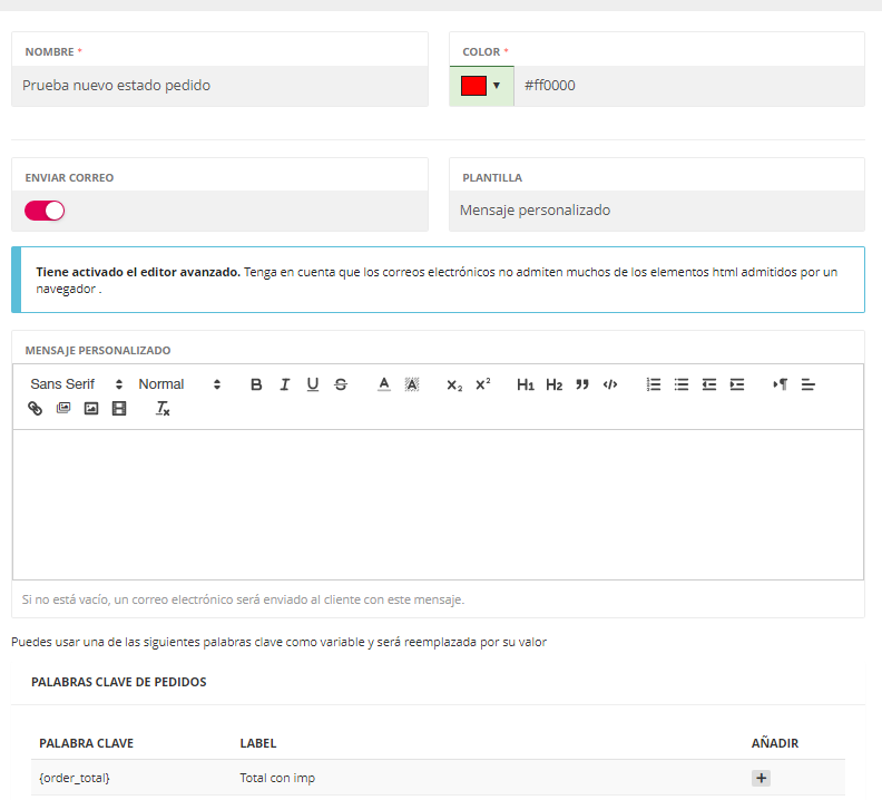 Al crear un nuevo estado de pedido podrá ajustar entre otros si el cambio de estado del pedido enviará un correo al cliente y editar el mensaje del correo. Para acceder al editor del mensaje del correo vinculado al estado del pedido hacer clic en botón "Enviar correo".
