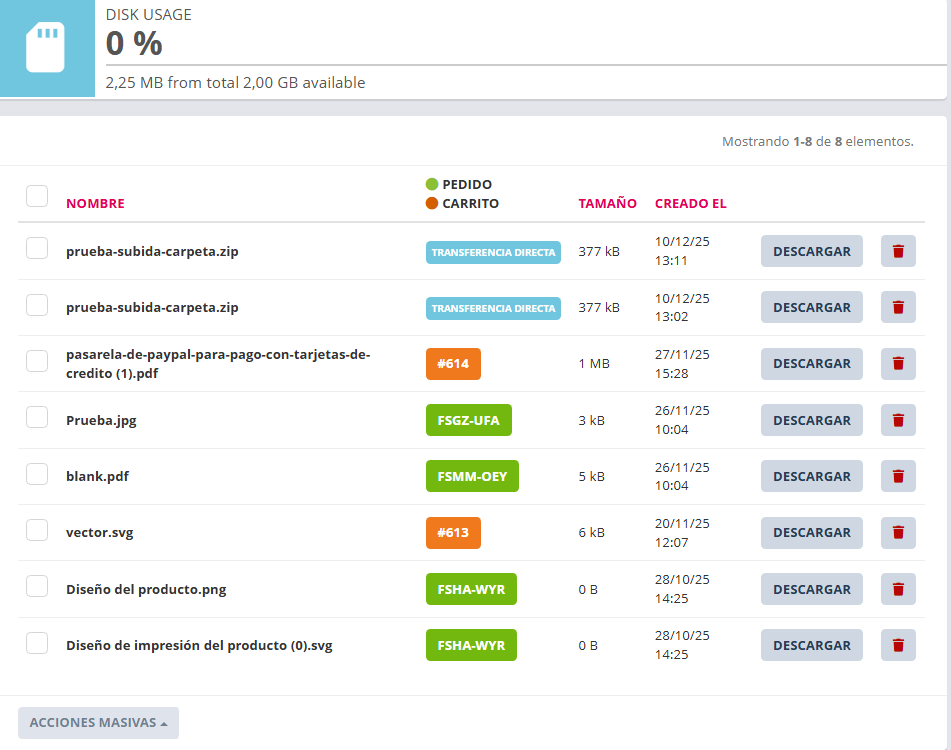 La sección Archivos de clientes permite gestionar los archivos que los usuarios han cargado en la plataforma durante su interacción con la tienda, asociados a productos, carrito, pedidos y subidos mediante herramienta de transferencia directa. Desde este apartado es posible visualizar los archivos almacenados, conocer su tamaño y fecha de creación, descargarlos y eliminarlos cuando ya no sean necesarios.