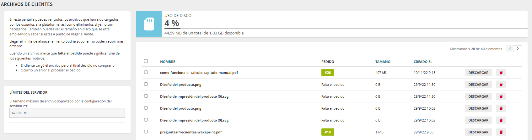 EnDesde estala opción del menú del Dashboard llamada Otros->Archivos de clientes se accede a la pantalla en la que se ven todos los archivos que han sido cargados por los usuariosclientes a la plataforma,plataforma. así como tambiéTambién pueden ser descargados y eliminados los archivos si ya no son necesarios.