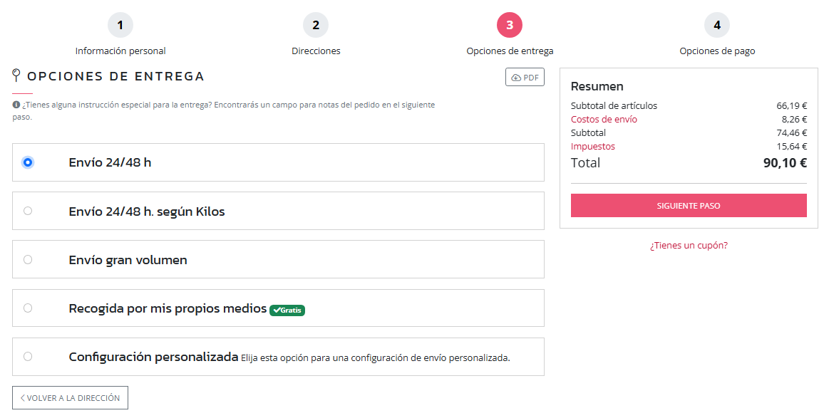 | Resumen | Se actualiza el importe de "Costos de envío", en función de la selección del cliente y la configuración de los transportistas. |