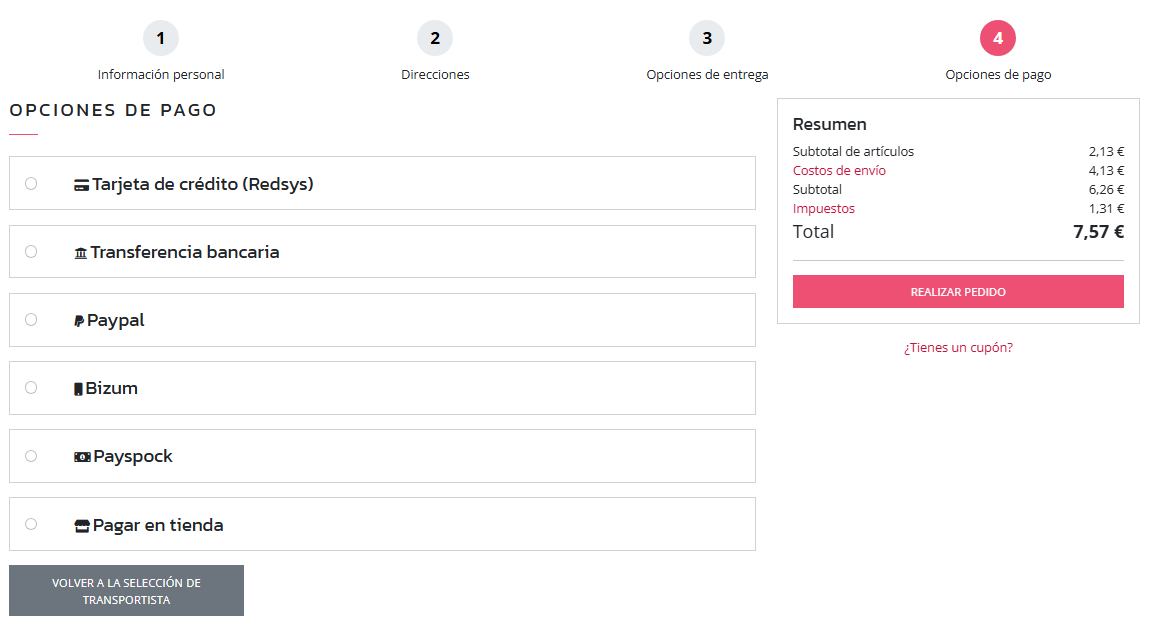 | Texto enlace "¿Tienes un cupón?" | Para abrir el campo de escribir cupón de descuento y acceder al botón validar cupón. |