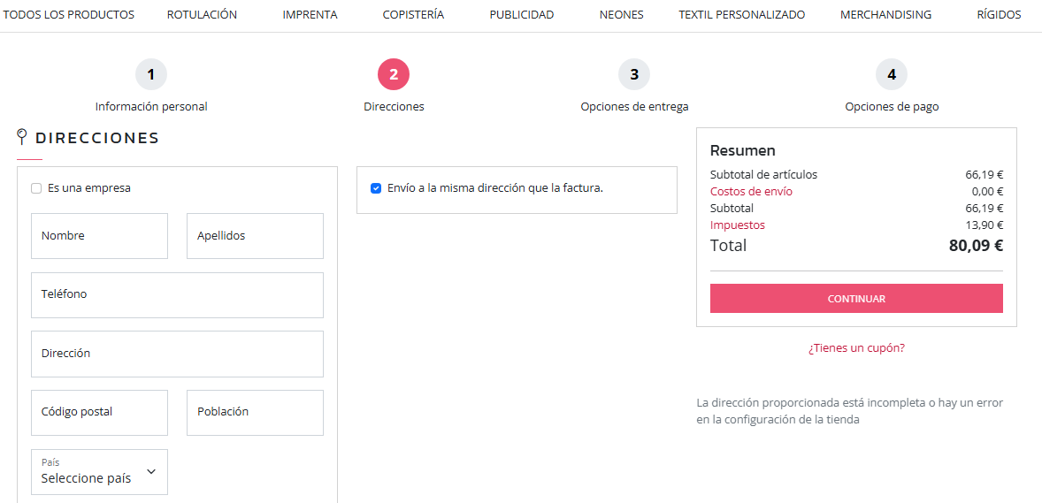 | Formulario de misma dirección para envío y facturación | Dispone de selectos de país. Al seleccionar el país, se muestra un selector de provincias. El cliente ha de cumplimentar este formulario para poder operar en la página 3 del carrito. |