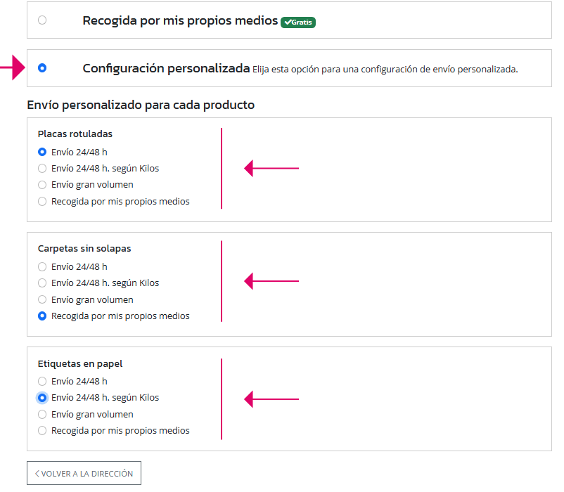 Mediante la opción de envío llamada "Configuración personalizada" el cliente puede hasta seleccionar un método de envío para cada producto del carrito, siempre y cuando se cumplan las tres variables descritas anteriormente.