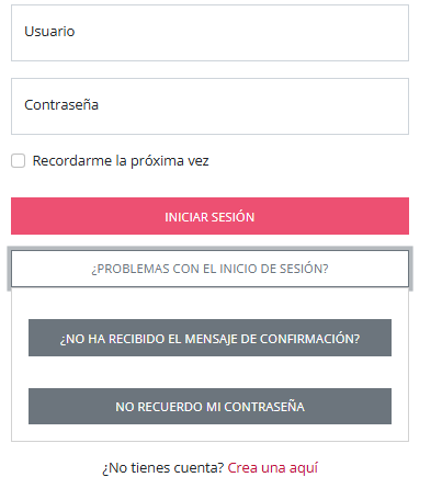 | Botón "Problemas con el Inicio de Sesión" | Para que el cliente acceda a los botones de acceso a las páginas ¿No ha recibido el mensaje de confirmación? y No recuerdo mi contraseña |