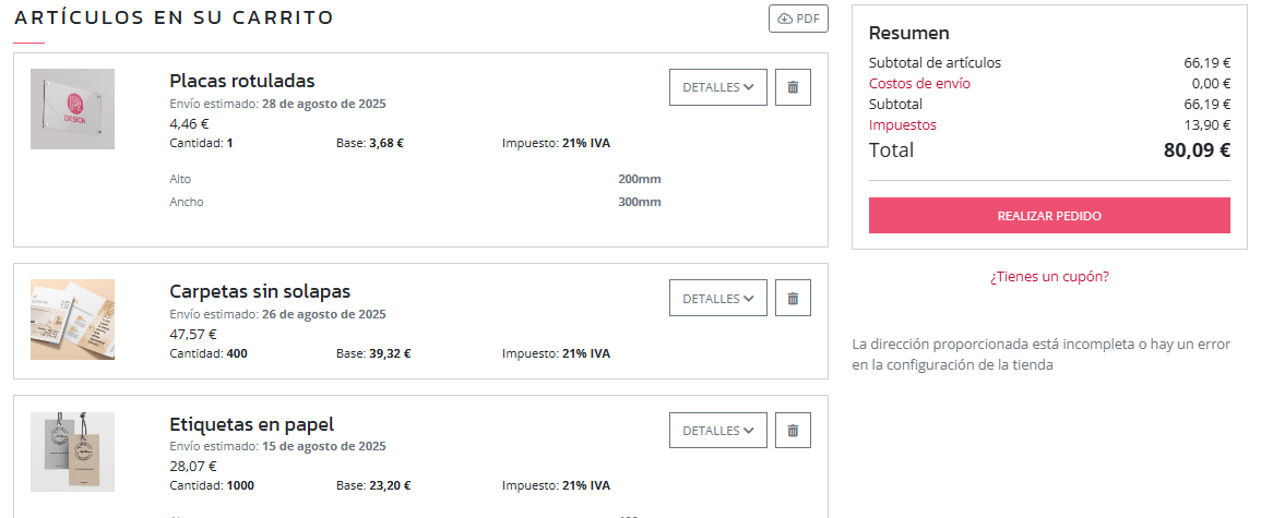 | Resumen | Desglose de importes. Los gastos de envío se muestran en 0 €. En la página 3 es dónde se seleccionan y contabilizan. |