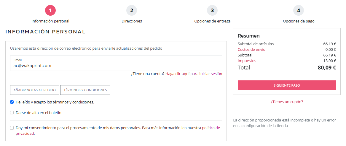 | Información de privacidad | *La información de la dirección puede almacenarse de manera segura en nuestros sistemas durante 5 minutos para usarla al confirmar el pedido. En lace a Política de privacidad. |
