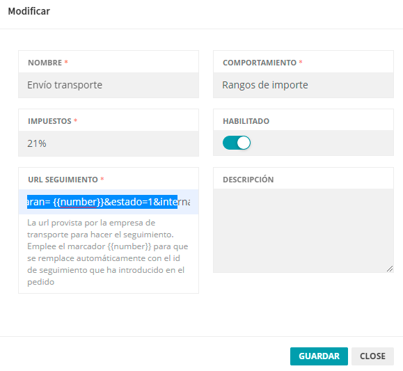 Acceder a ver un seguimiento real de un pedido del transportista. Copiar la url en la que se refleja el número de tracking y pegar en el campo titulado "Url de seguimiento".