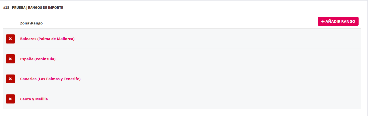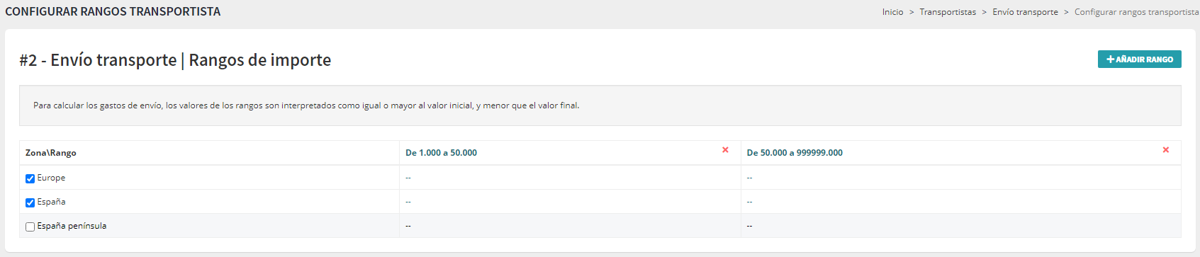 Dispone de un botón a la derecha para añadir rango y de un listado con todas las zonas creadas precedidas de una casilla para chequear una o varias. La o las que se quieren crear rangos de gastos de envío. En la siguiente imagen de ejemplo se ha creado  un mismo rango a dos zonas. Los gastos de envío se especifican en cada zona de forma independiente.