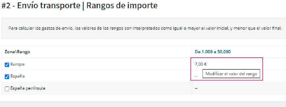 • Los rangos en la intersección con las filas de las zonas habilitadas presentan un campo para especificar el importe de gasto de envío a aplicar cuando se cumpla la lógica de valor mínimo y valor máximo del rango.