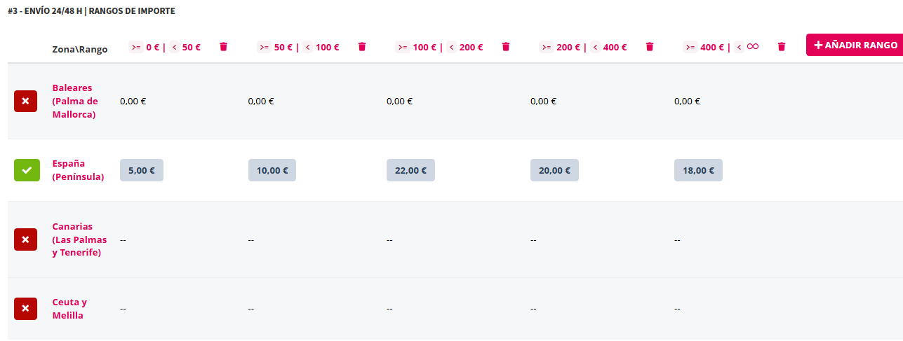 • En cada zona se puede especificar un importe de gastos de envío sin IVA para cada rango.